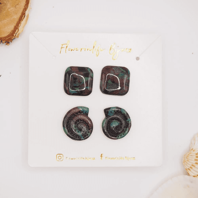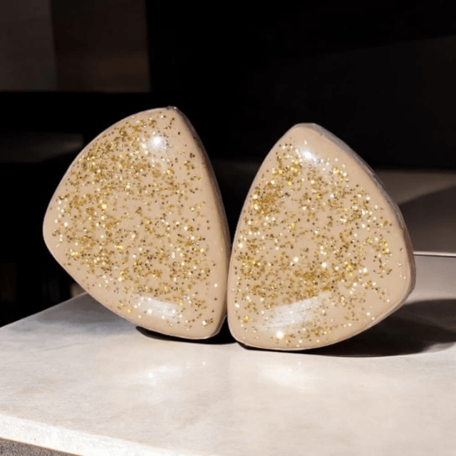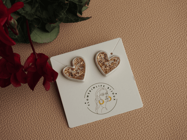 - Matériaux : Pâte polymère, paillettes dorées, résine, clou d'oreille en acier inoxydable