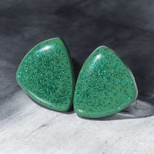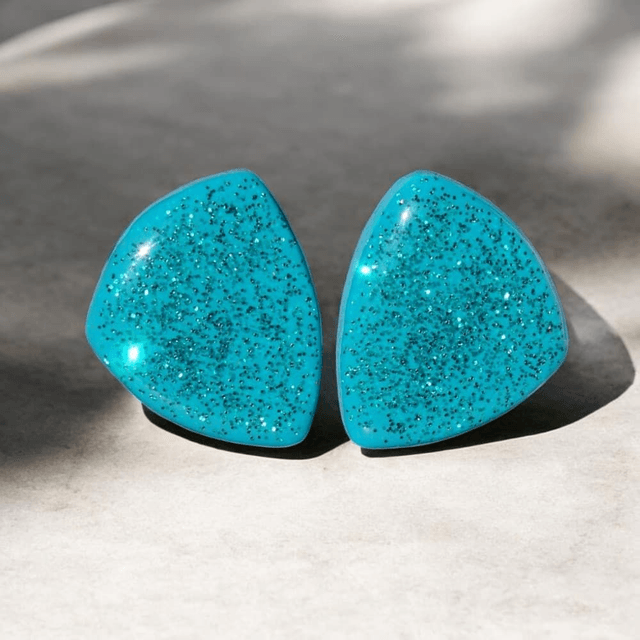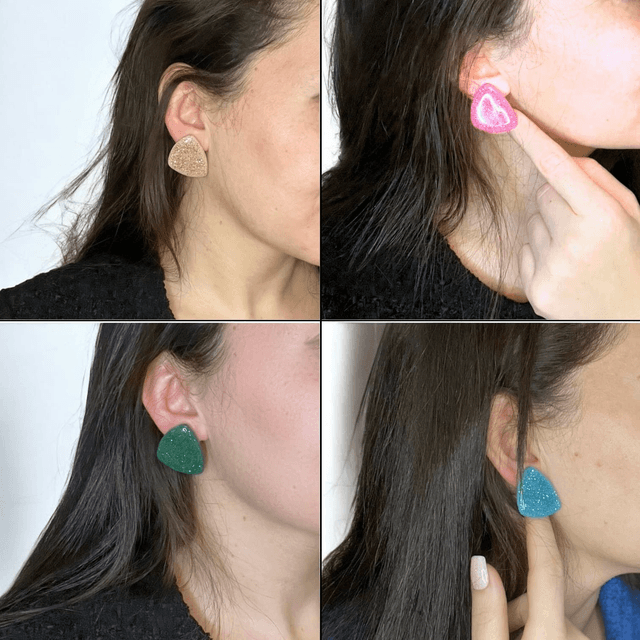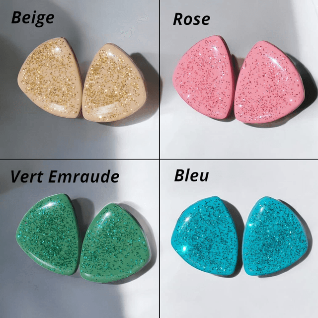 Ces boucles d’oreilles triangulaires sont parfaites pour apporter une touche d’éclat à votre tenue. Fabriquées à la main en pâte polymère avec des paillettes et une finition en résine brillante, elles sont légères et agréables à porter. Leur forme triangulaire aux bords arrondis leur donne un look moderne et élégant.