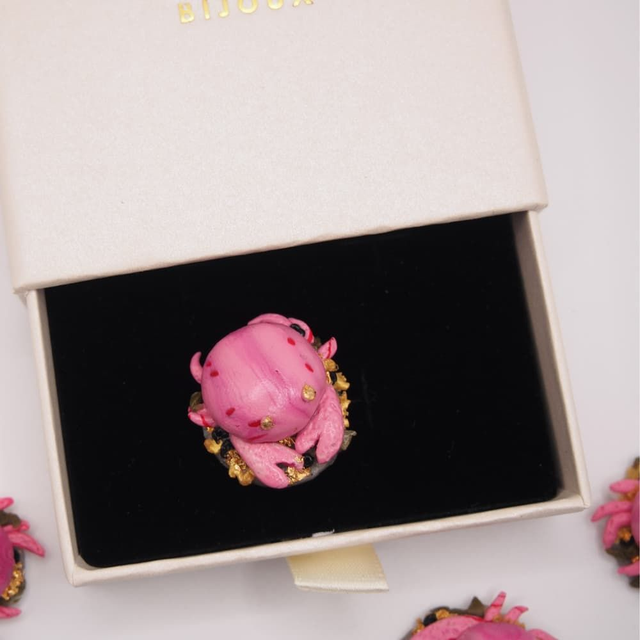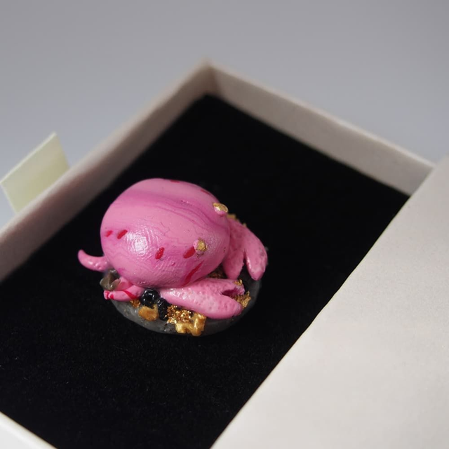 Au centre, un petit crabe est entièrement modelé à la main en pâte polymère. Son rose fuchsia, à la fois vif et nuancé, est parsemé de délicates touches dorées qui accrochent la lumière. Il repose sur un fond texturé rappelant un rocher marin, créant un joli contraste.