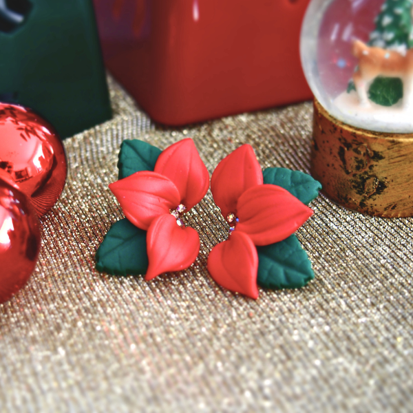 Des bijoux de Noël faits main, avec des motifs de fleurs de Noël, de cannes à sucre et de flocons, pour un look féérique et festif.
