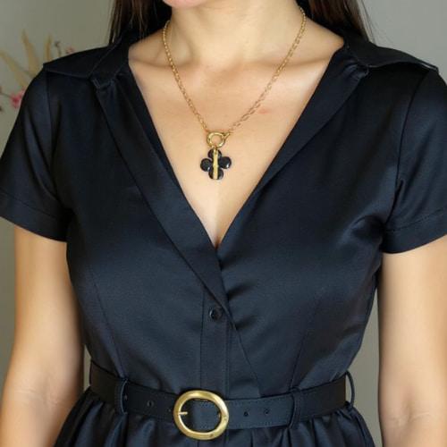 Pour un style plus graphique et sophistiqué, rien de tel que le noir pour contraster avec le bleu marine. Notre collier trèfle noir est un choix audacieux et élégant. Le pendentif en forme de trèfle, symbole de chance, apportera une touche de mystère et de modernité à votre décolleté. Associé à une robe bleu marine, ce bijou attirera les regards et soulignera votre goût pour les accessoires de caractère. C'est le bijou parfait pour une soirée chic ou un événement spécial.