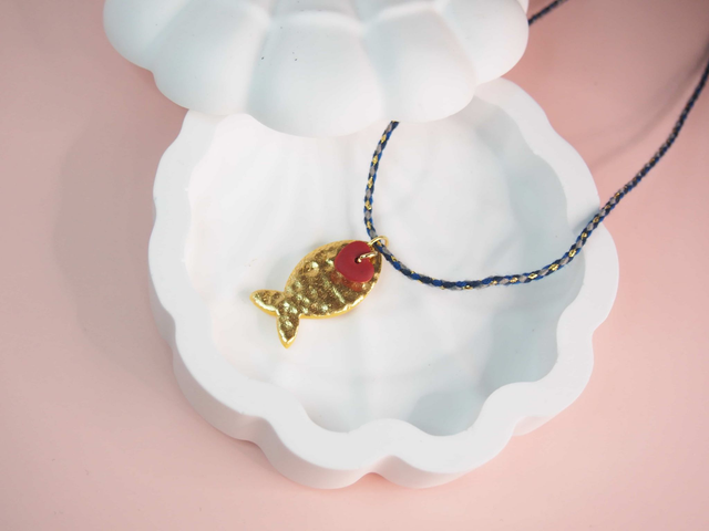 Ce collier cordon capture l'essence de la liberté. Associant la silhouette brillante d'un poisson doré à la touche passionnée d'un petit cœur rouge, ce bijou est un véritable grigri solaire.